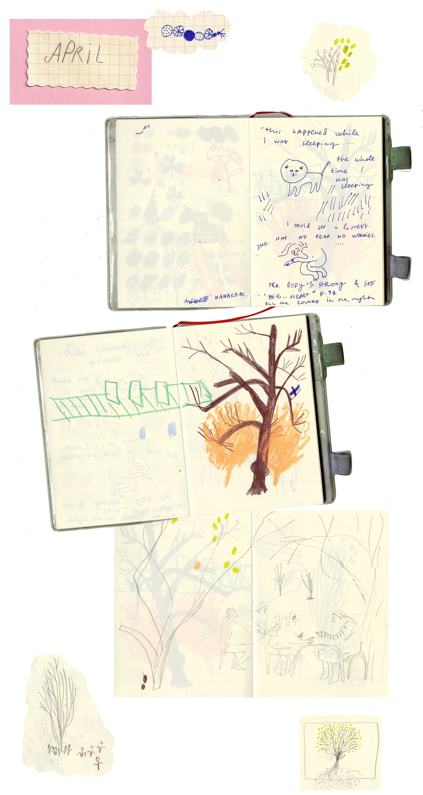 I finally finished reading All the Lovers in the Night by Mieko Kawakami, the first spread is the quote from that book. I think I was also dreaming about things then, but now I can’t remember my dreams.