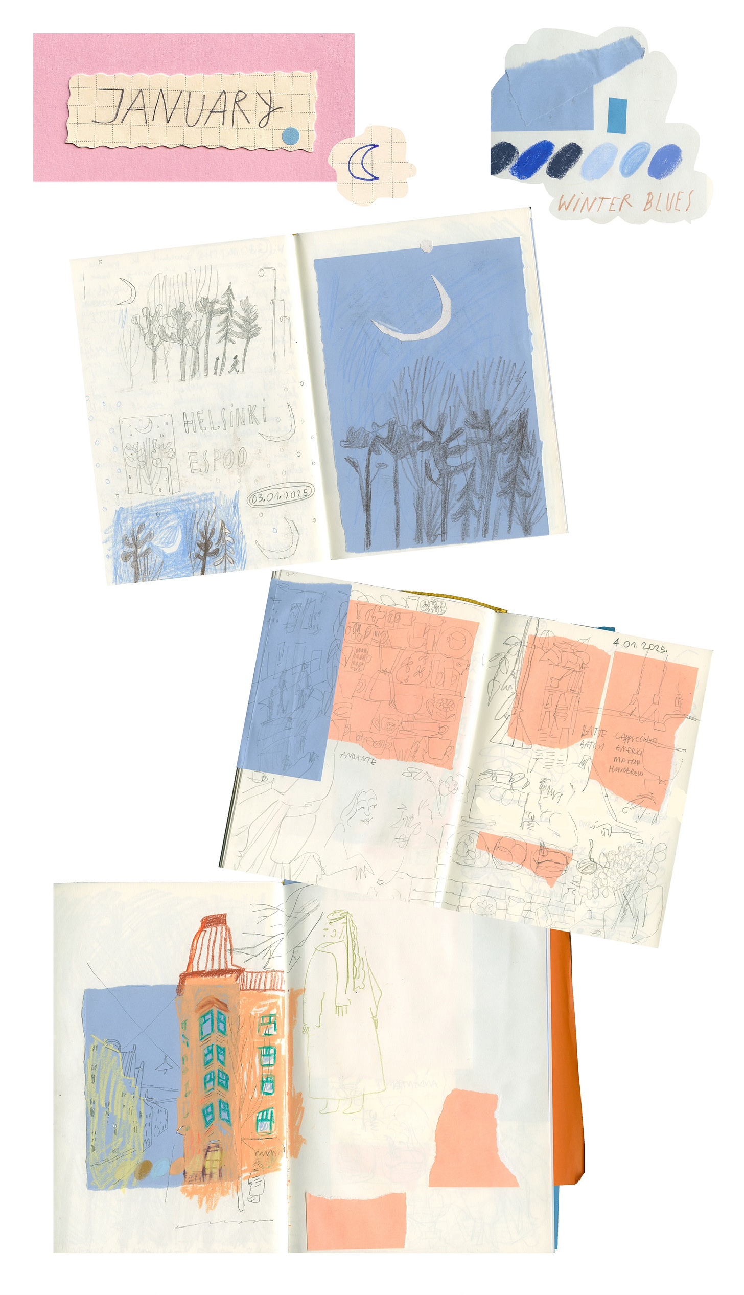 Beginning of the year was so chaotic and busy and inspiring, I drew all December and January, it was incredible. I moved to Helsinki on the 2nd of January. I’m am doing my MA now and was able to go on an exchange to Aalto School of Art for a semester. It was quite cold when I arrived and very beautiful. I spent my time visiting cafes, museums, going for short runs and admiring the pines and snow.