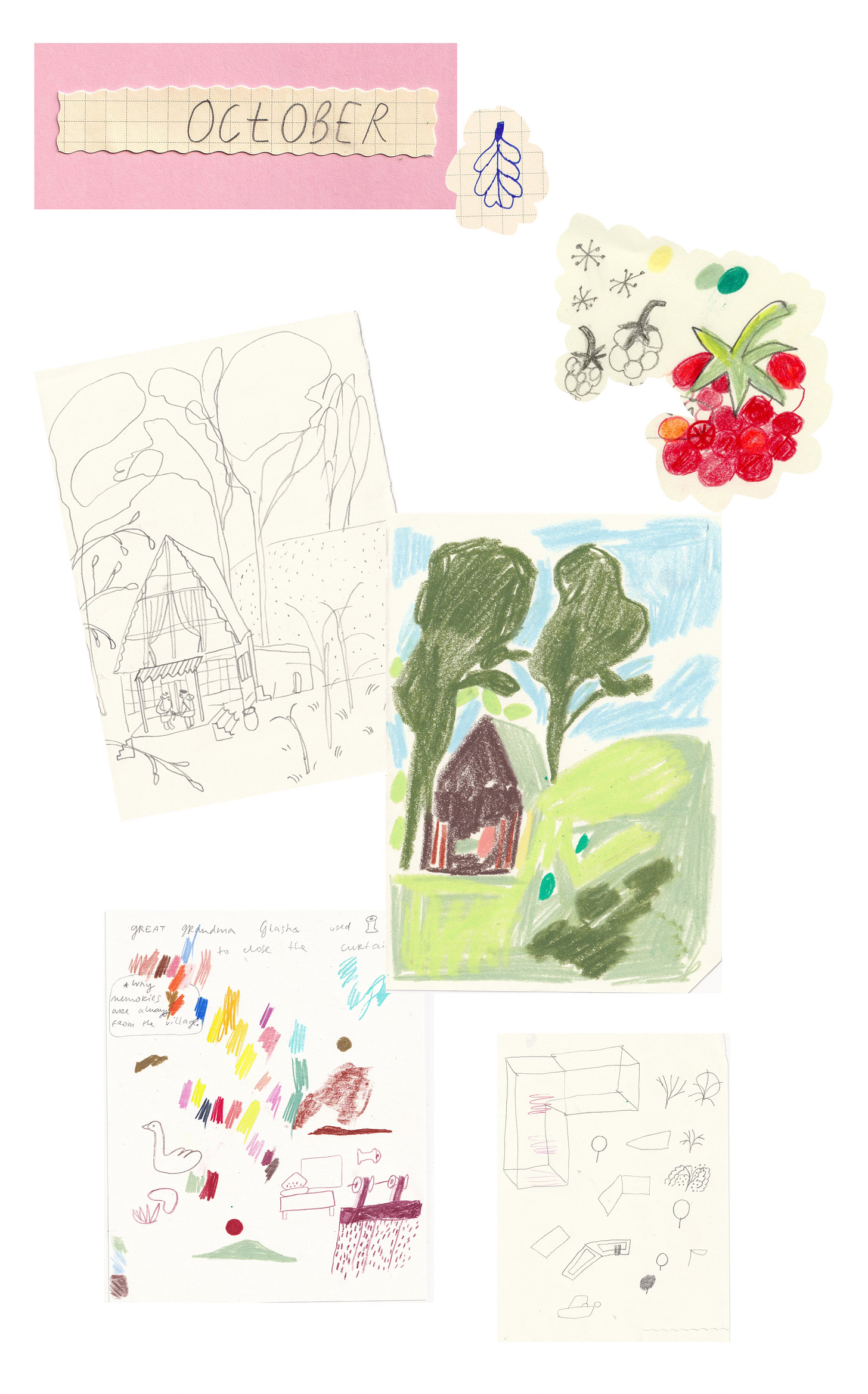 My parents are visiting and we are doing a lot of things together, like getting almost stuck on top of a mountain and going thrift shopping. At some point as part of my masters project I talked to them about their idea of belonging, heritage etc. I take some notes, I also drew my grandparents summer house near Homiel, Belarus. Built by my grandparents and great grandad. I spent each summer there as a kid. And my mum tells me about her grandmother and her memories of the time with her in the village. My masters project theme is all about belonging and heritage and of course illustration.